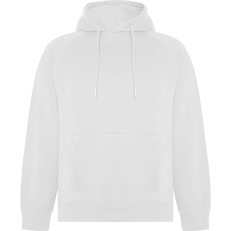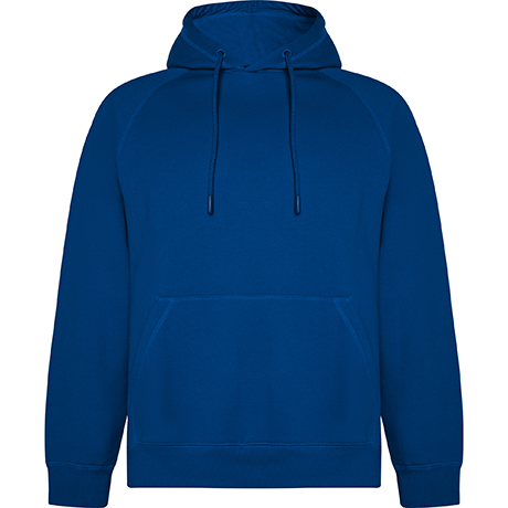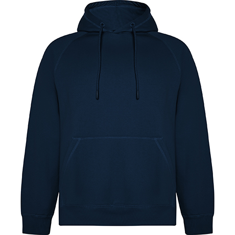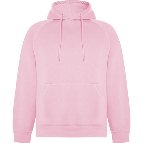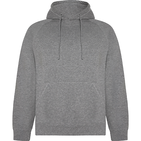 Sweat unisexo com capuz em algodão orgânico e poliéster reciclado. Bolso canguru. Capuz forrado em ponto liso e cordões redondos ajustáveis, “ilhoses” bordadas. Gola, punhos e cós em ponto canelado 2×1.