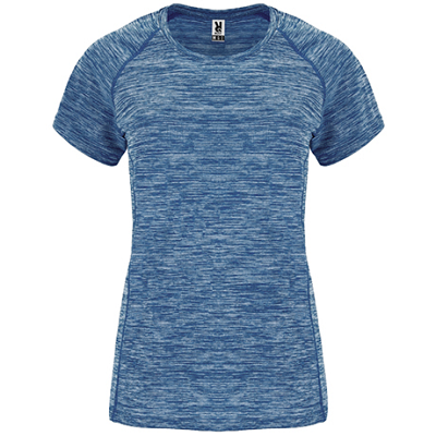 Camisola técnica de mulher em tecido poliéster de manga curta estilo ranglan. Gola redonda. Camisola de tecido com ajuste confortável e facilmente adaptável ao corpo.