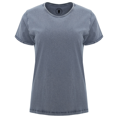 T-shirt de manga curta efeito jeans para mulher. Gola redonda em ponto canelado 1×1 com fita tapa costuras reforçada de ombro a ombro. Costura dupla nas cavas. Abertura de manga com baínha.